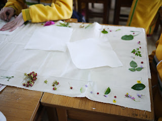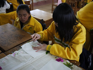 同學們開始敲敲打打,在一張張的大型棉布上,分工合作的把植物汁液敲上去。讓植物的顏色與輪廓就留在棉布上了。